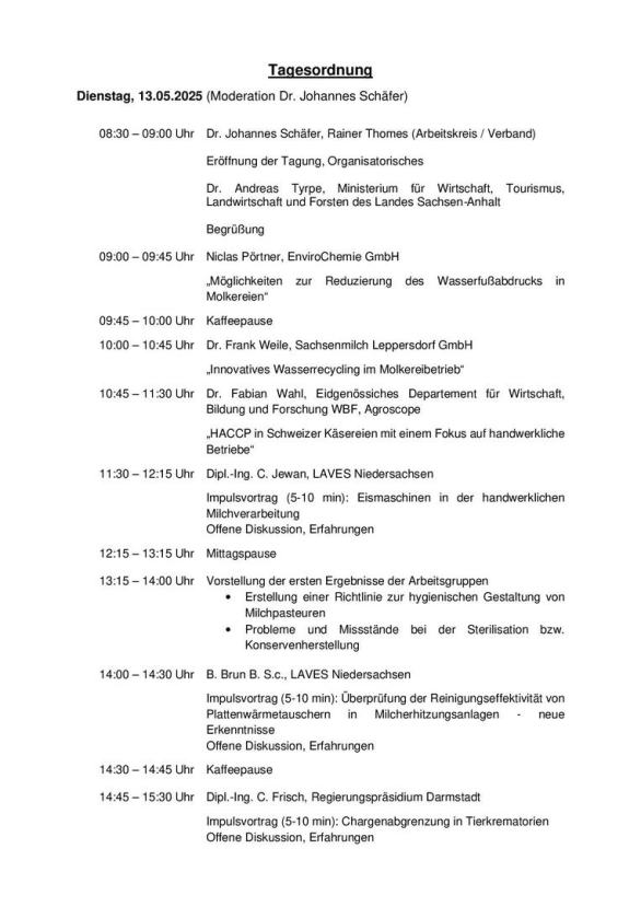 Die diesjährige Arbeitstagung unter der Organisation des LAVES, Niedersachsen (Herr Dipl.-Ing. Rainer Thomes) und der Leitung des Max Rubner-Instituts (MRI), Bundesforschungsinstitut für Ernährung und Lebensmittel, Standort Kiel (Herr Dr.-Ing. C. Kiesner) befasst sich im Allgemeinen Teil der beiden Arbeitskreise mit Fachvorträgen zu aktuellen Fragen der Nachhaltigkeit in der Milchwirtschaft, der Sicherung des gesundheitlichen Verbraucherschutzes sowie der Technologie und Qualität bei der Herstellung von Milcherzeugnissen. So wird über neue Erkenntnisse einer energie- und ressourcenschonenden Verarbeitung von Lebensmitteln, insbesondere unter Nachhaltigkeits- und Umweltgesichtspunkten vorgetragen. Damit wird aktuellen gesellschaftlichen Forderungen ebenso entsprochen wie gesundheitlich-hygienischen Ansprüchen an die Verarbeitung von Milch. In dem Zusammenhang wird über die Problematik des Nachweises von Antibiotikarückständen in Milch und erste Möglichkeiten alternativer Systemen berichtet. Nachfolgende Vorträge befassen sich mit Hygiene- und Qualitätsaspekten von Milch und spezifischen Milcherzeugnissen durch neue Technikansätze sowie Prüfsysteme zur Kontrolle und Dokumentation. Am zweiten Tag wird in getrennten Sitzungen der Arbeitskreise bei den technischen Sachverständigen / Amtsingenieuren über die Prüfung in den Ländern und den Prüfstellen (MRI Kiel, TU München WZW Weihenstephan) berichtet sowie über aktuelle hygienisch-qualitative Fragen der Risikobewertung und praktischer Erfahrungen lebensmittelbedingter Probleme in den Unternehmen (Betriebszulassung, Ursachenforschung, Entsorgung) vorgetragen und diskutiert. Der Arbeitskreis der Beratungsingenieure sowie Architekten behandelt intensiv versicherungsrechtliche Fragen, bauliche Aspekte (hygienische Akustik/Gestaltung von Produktionsräumen, solarthermische Prozesswärme) und verfahrenstechnische Themen (Energiemanagementsysteme, Wärmerückgewinnung).